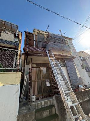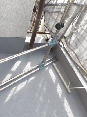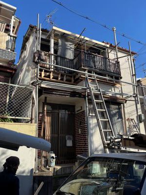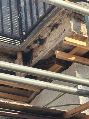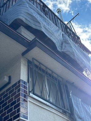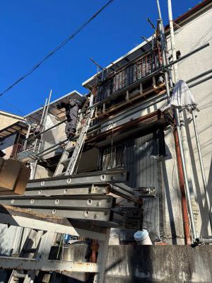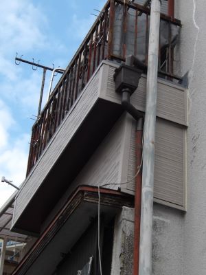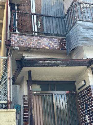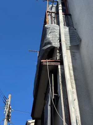 | 2024年9月、入居者さんから手紙が来ました。内容を要約すると、2022年10月14日に突然外壁が崩れました。という内容で 最初は日付の聞き間違いかと思いましたが、外壁が崩れたのは2年前でした。電話をして状況を詳しく話を聞くと10年前から雨漏りは始まっており、 おそらくですがベランダの防水が切れ、すき間から外壁内部に雨が侵入し、時間をかけてベランダと外壁の下地が劣化したため外壁が崩れたんだと思います。 すぐに修理の依頼を業者さんにしたのですが、いつもお願いしている大工さんがケガをして、すぐにはできないとのことで新しい業者さんを探すことになり、 6社ほど見積りをとり、施工内容と金額があった業者さんに修理をお願いしました。 足場を組み、4日間で修理完了です。 |