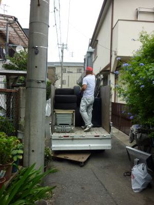 | 雨漏りが2箇所あり、ブルーシート等で室内に雨が入らないようにしていますが、 簡易な対策では解決にはなりませんので、屋根の修理も必要です。 今回は、壁なども一度撤去して作り直すリノベーションをすることにしましたので、 解体工事で部材を処分することになりますので、同時進行で室内に残っていた荷物やゴミたちも処分してもらいました。 タイヤや洗濯機は別処分なので、これだけは個別でトラックに積んでいました。 |