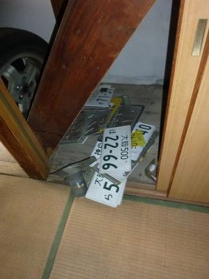 2号室の引渡し直後の室内です。玄関扉のガラスも割れていますし、車のタイヤ8本を含め荷物が散乱していました。 ゴミの量は今までのごみ屋敷と比べるとかなり少ないので、 リフォームと同時進行で業者さんに処分をお願いすることにしました。 |
