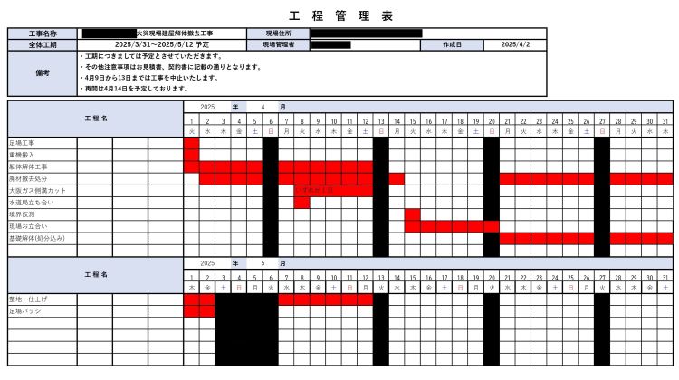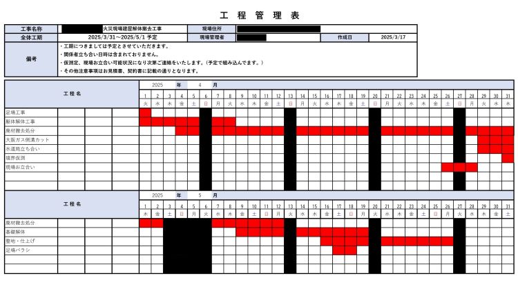 【2025 3/24】 解体工事の現場立会と境界の仮測量説明 工程表の4/26、27、28に現場お立合い 4/31に境界仮測という項目があり、確認の電話をしました。 現場お立合いは、解体が進み、壁や焼けただれたゴミは処分をして行きますが、 室内に残っている物は捨てずに、この日に必要な物があれば、持ち帰れる期間として 日程を設定しています。火災直後からいつ崩れてもおかしくない危険な状態でしたので 室内に入るのも危険でした。安全に解体が進み、必要なものがあれば、持ち帰ってもらい それ以降は、室内に残っている焼け残った荷物も含めて処分を開始するそうです。 境界仮測は、解体が完全に完了すると、お互いの境界があやふやになってしまうので、 解体を進めるが、お互いの壁の基礎部分だけ残し、その壁の中心線で測量をして お互いの土地の境界を明示するための測量をする日です。 現場立会も私は必要ありませんし、 測量も測量士が既存の壁を基準にするので立会いは必要ないとのことでした。 【2025 3/28】 工事完了が早まる 市との協議がうまくいき、火災の被害の規模が多いこともあり ゴミの制限の緩和を認めてもらい工事完了が早まりゴールデンウィーク明けぐらいには 完了できそうだということでした。 【2025 4/2】 新工程表 工期が早まったため、新しい工程表が送られてきました。 何事もなく無事に工事が終わることを願います。 |