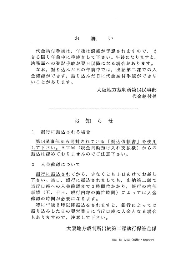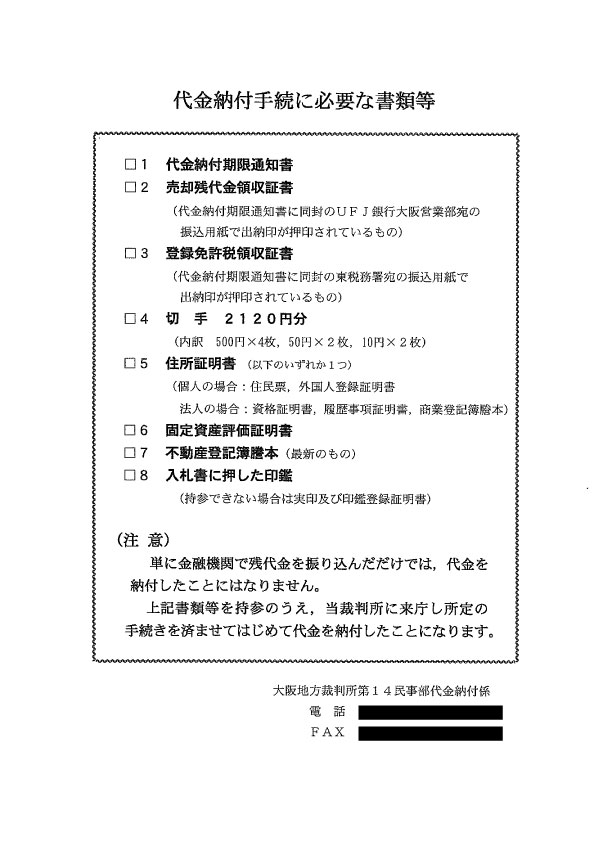 下記に大阪地方裁判所が代金納付通知書へ同封している注意書きを載せておきます。