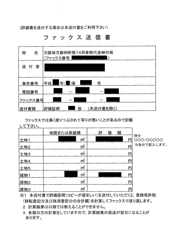 といっても、評価証明書に記載されている内容を、代金納付通知に同封されている下記の送信書に記入し、裁判所へFAXするだけです。